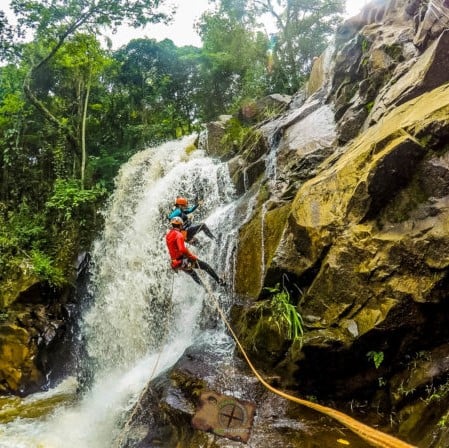 Aproximação de 5 min de caminhada, 1,5 km de marcha aquática sobre o leito do rio e 8 trabalhos de corda: